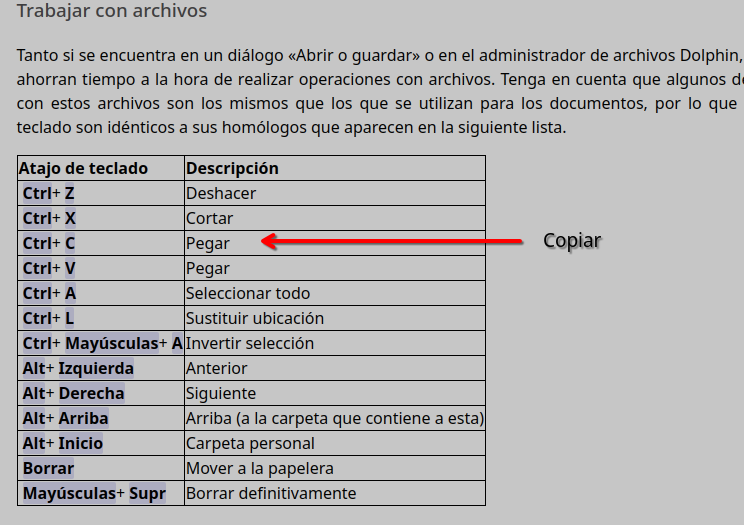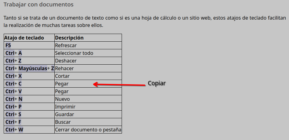 Para el Atajo de teclado *Ctrl+C*, en la Descripción, se indica